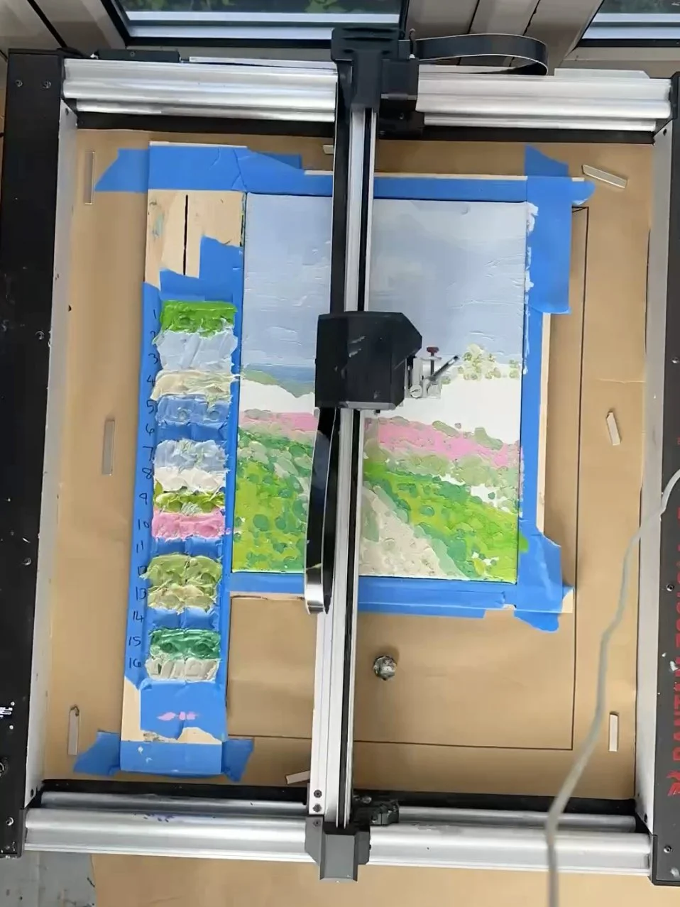 Collard’s method moves through systems rather than through the direct touch of the hand alone. Working with a pen plotter machine, Collard paints directly onto the canvas in oil, using software he has developed to guide the movement of the brush across the surface. The image is built through programmed marks, layered strokes, and repeated passes, so that what emerges is both mechanically produced and visibly painterly. Variation in density, rhythm, and texture comes through the interaction between digital structure, the movement of the machine, and the material properties of paint. Collard’s work, in many ways, is hand-painted by machine.