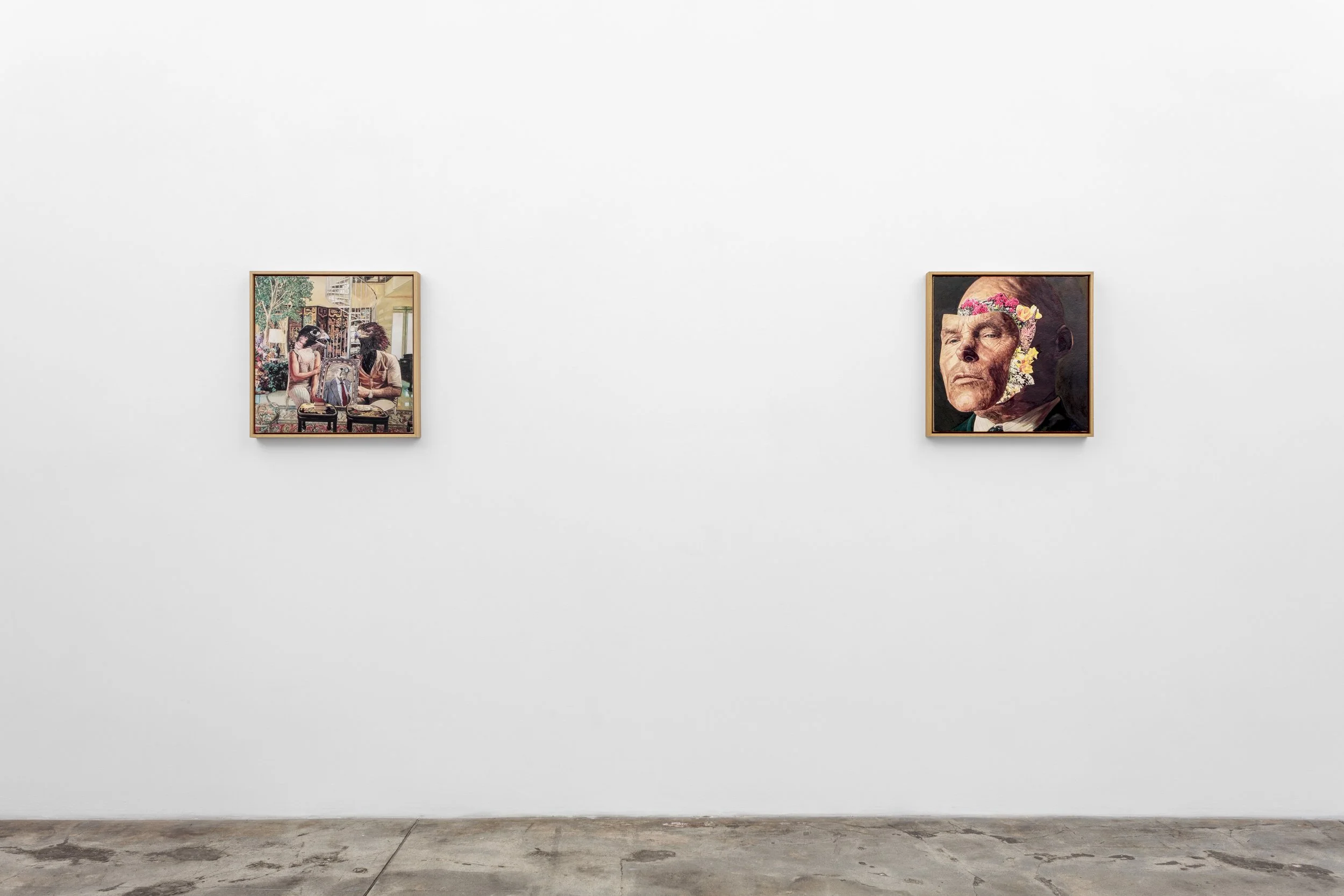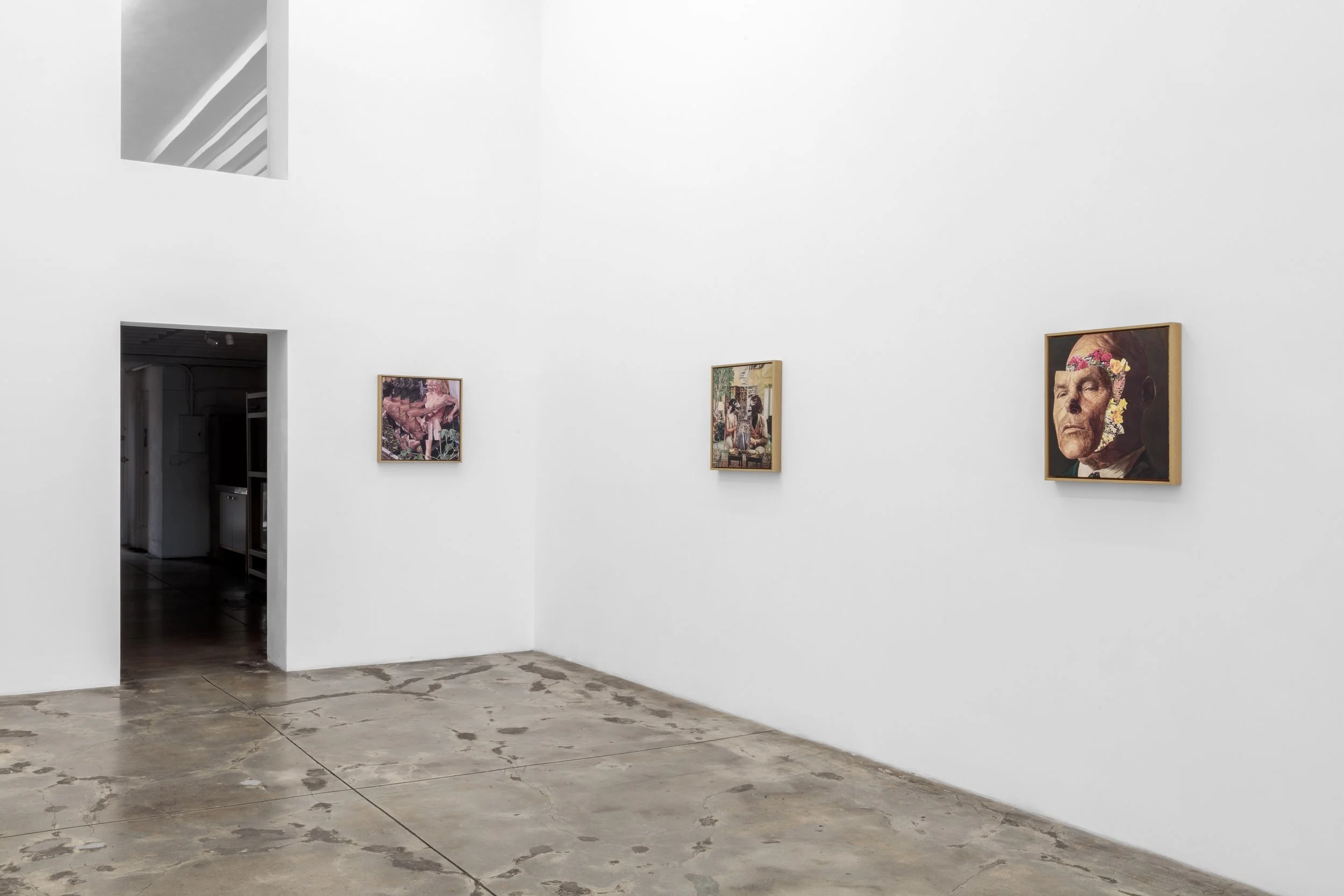 Regante develops her compositions through analog collage—cutting and reassembling visual ephemera until a composition intuitively takes shape. From these paper fragments, she builds each oil painting layer by layer, rendering her subjects with a quiet precision that balances the surreal with the sincere. In Tupperwave Abode, a 1950s Tupperware party unfolds in a floral-drenched living room, overseen by a giant cuttlefish, transforming a scene of domestic ritual into something mythic and absurd. In Once Twice Three Times a Lady, Regante reimagines imagery from a 1970s porn film, creating a layered portrayal of pleasure, detachment, and repetition. A moment of sexual intimacy becomes fragmented—arms elongate, bodies echo, slipping into abstraction. Through her “fragmenting” technique, she evokes motion, time distortion, and the glitch-like duplicity of pornographic fantasy.